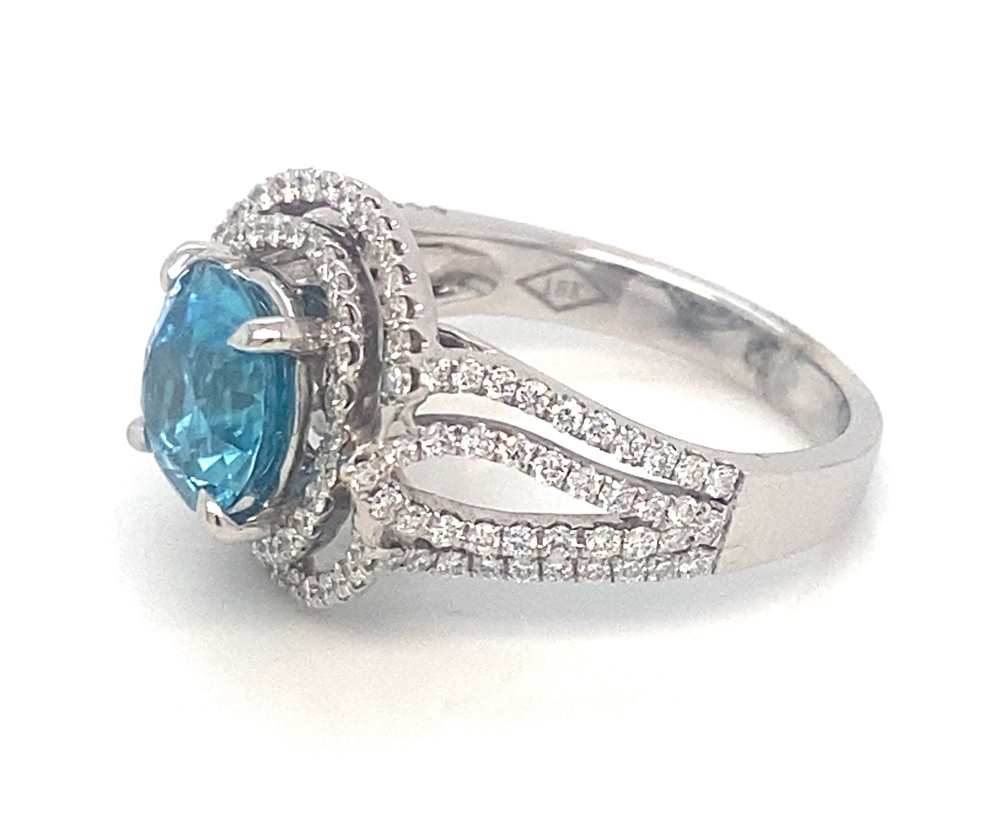 18K White Gold Blue Zircon Double Halo Diamond Ring